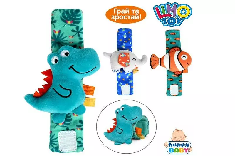 Брязкальце на руку HB 0108 ABC браслет, 16см, застібка-липучка, брязкальце, плюш, 3 види(динозавр, слон, рибка), у пакеті, 11-16-3см 21352 МАСЯНЯ