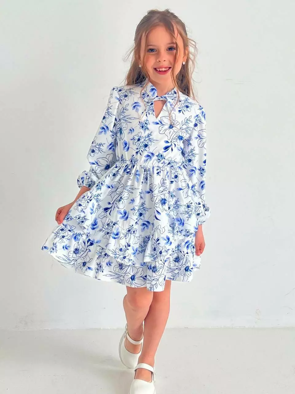 синім квітковим принтом. Модель має довгі рукави з