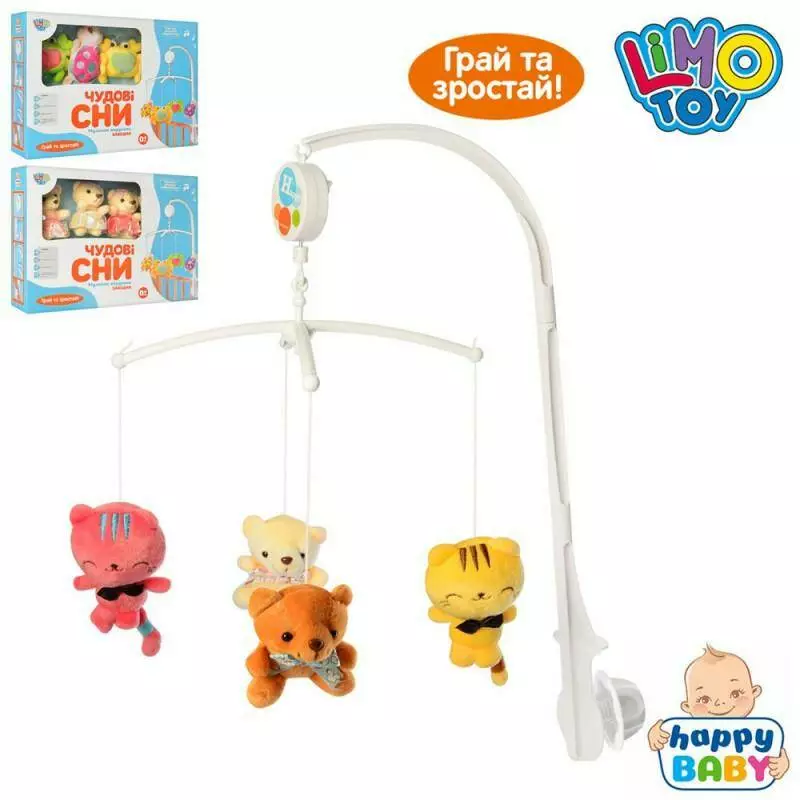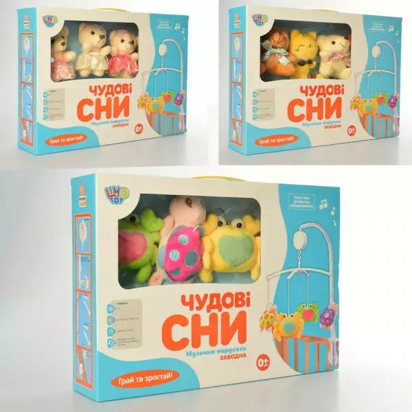 Карусель D066ABC (24шт) на кроватку, заводная, муз, подвески 4шт, плюш, 3вида, в кор-ке,38-27-8см 29983