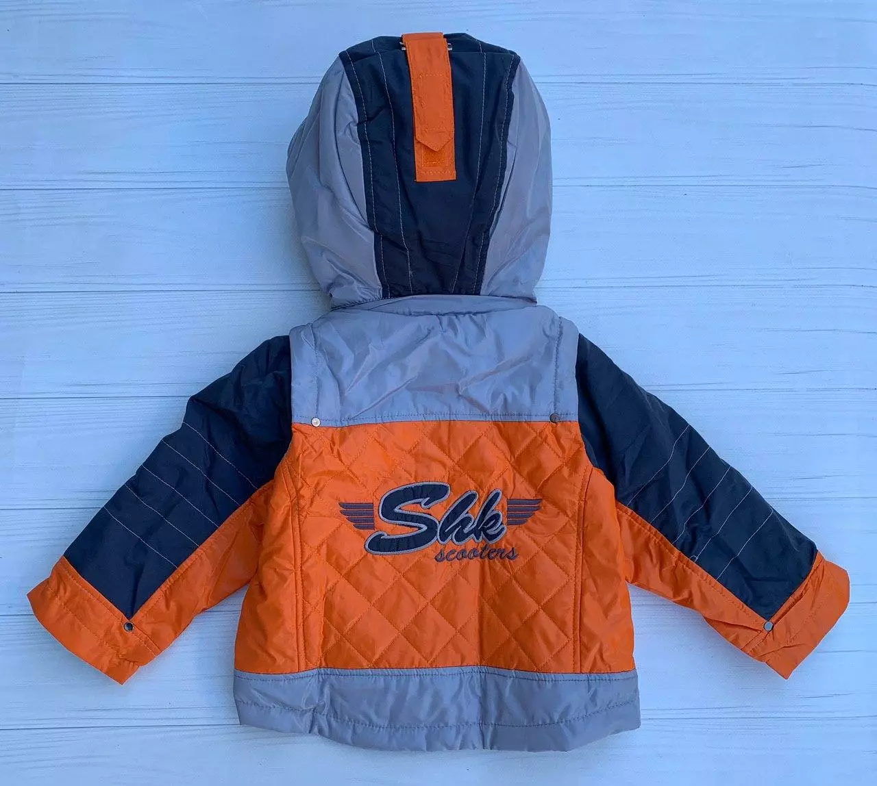 куртка застегивается на молнию, снаружи два кармана, съемный капюшон.