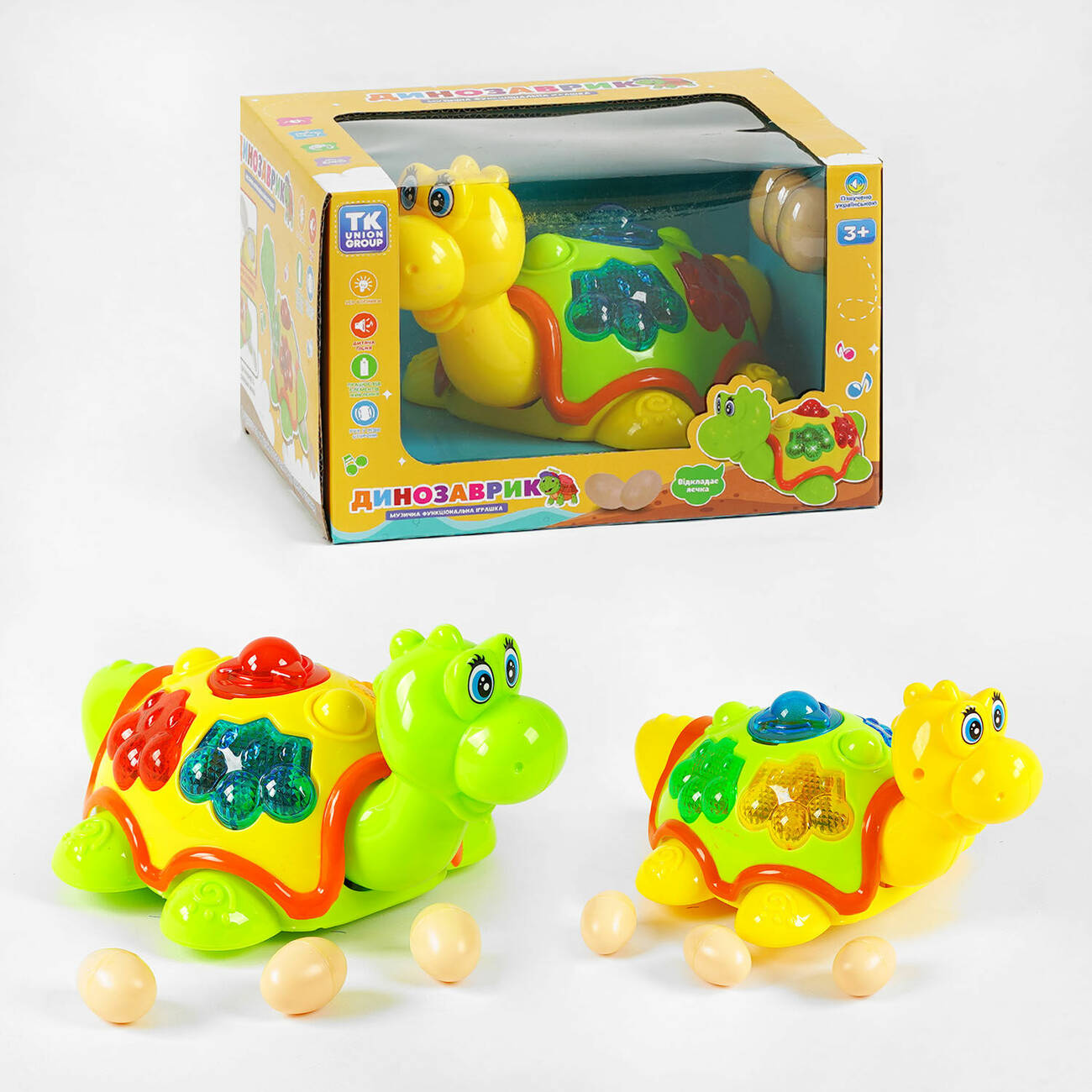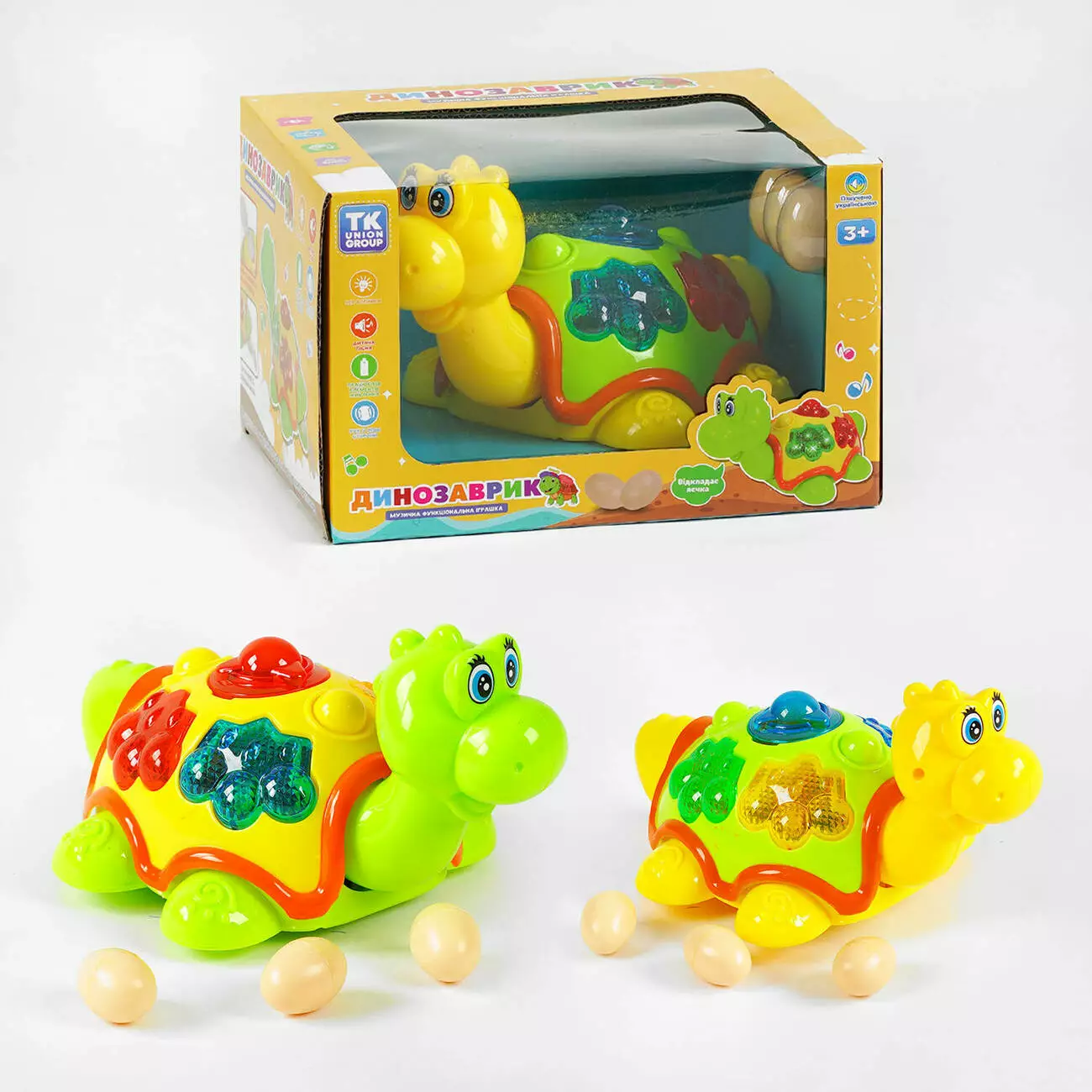 Музичний динозаврик TK 50633 "TK Group", 2 кольори, ОЗВУЧУВАННЯ УКРАЇНСЬКОЮ МОВОЮ, світло, колесо вільного руху, пісня, яйця, в коробці 142839 7..