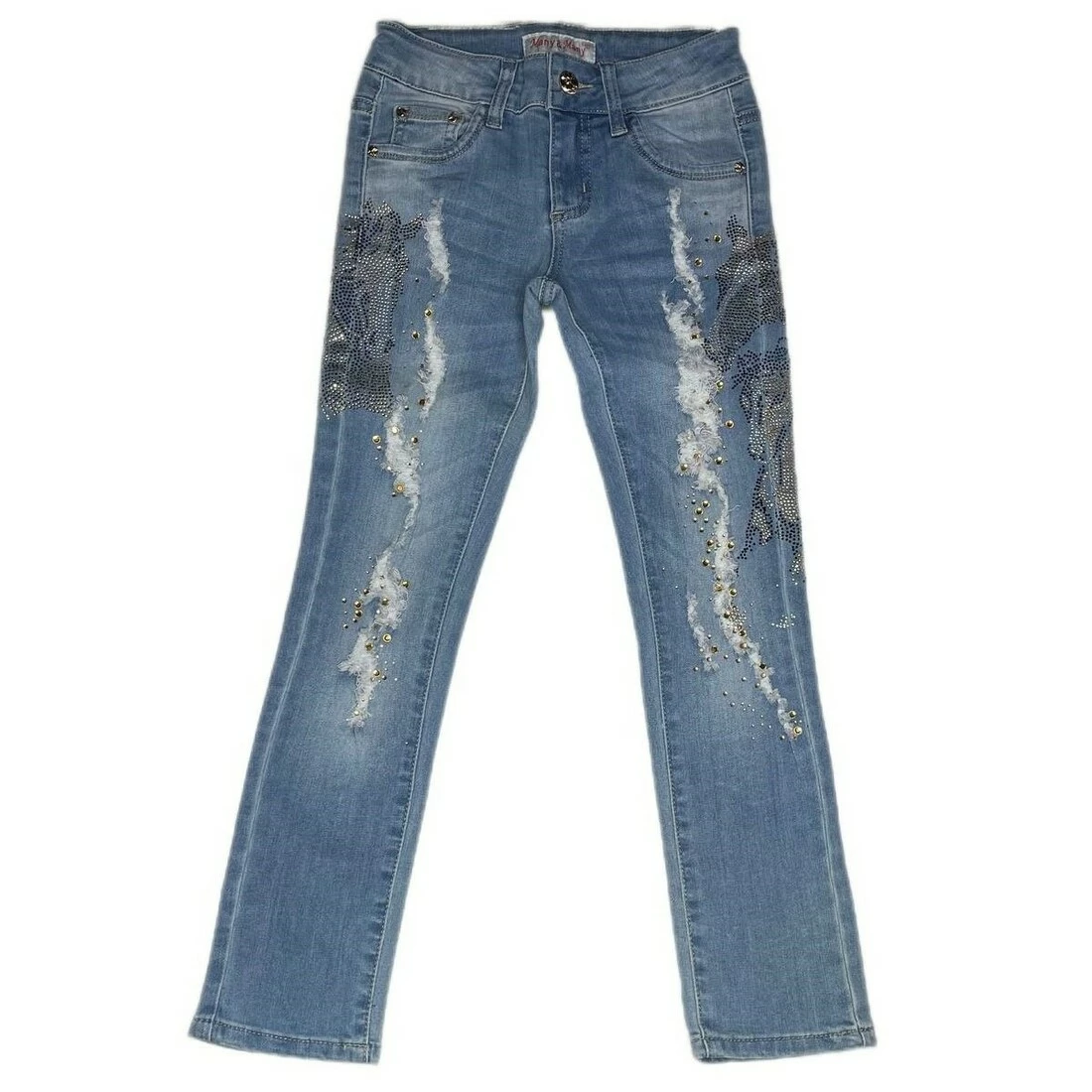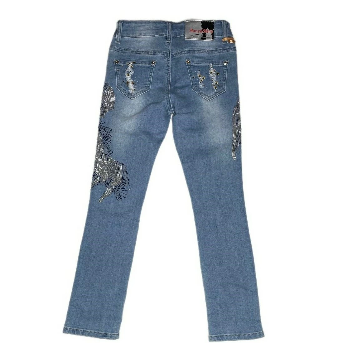 <p>Стрейчові джинси з потертостями, декоровані камінчиками. В